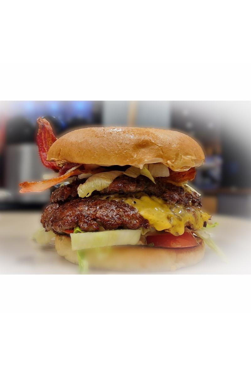 Eldhusrøkt Bacon. Cheddarost, Salat, Tomat, Agurkmiks, Dressing