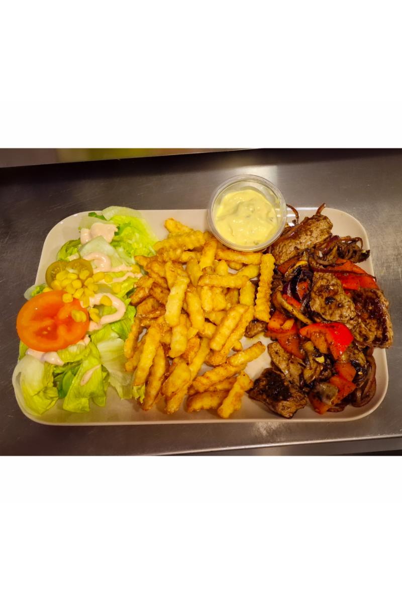Strimlet biffkjøtt stekt i Rapsolje med grønnsaker, Chips, Salat, valgfri saus
