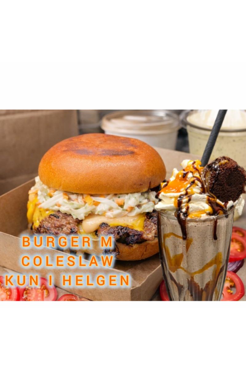 Coleslaw burger bbq tomat løk ost pluss Shake. gluten egg melk